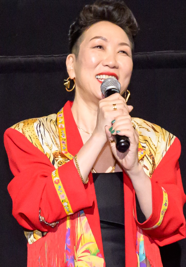 最初にHIKARI監督登壇!白のパンツに朱赤の派手な模様の法被のような衣装で登場!