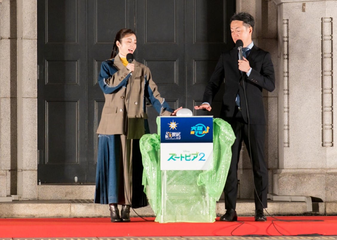 再びステージに登壇した上戸さんは、感激で「大阪って素敵ですね!なんかこういう大阪の皆さんを盛り上げよう!元気づようという、この企画自体に感動しています。ズートピアのプロジェクションマッピング映像も見られて本当に嬉しかったです。すごいものをみさせていただきました。ありがとうございます」と感激の気持ちを伝え、セレモニーは大盛況のうちに終了となりました。