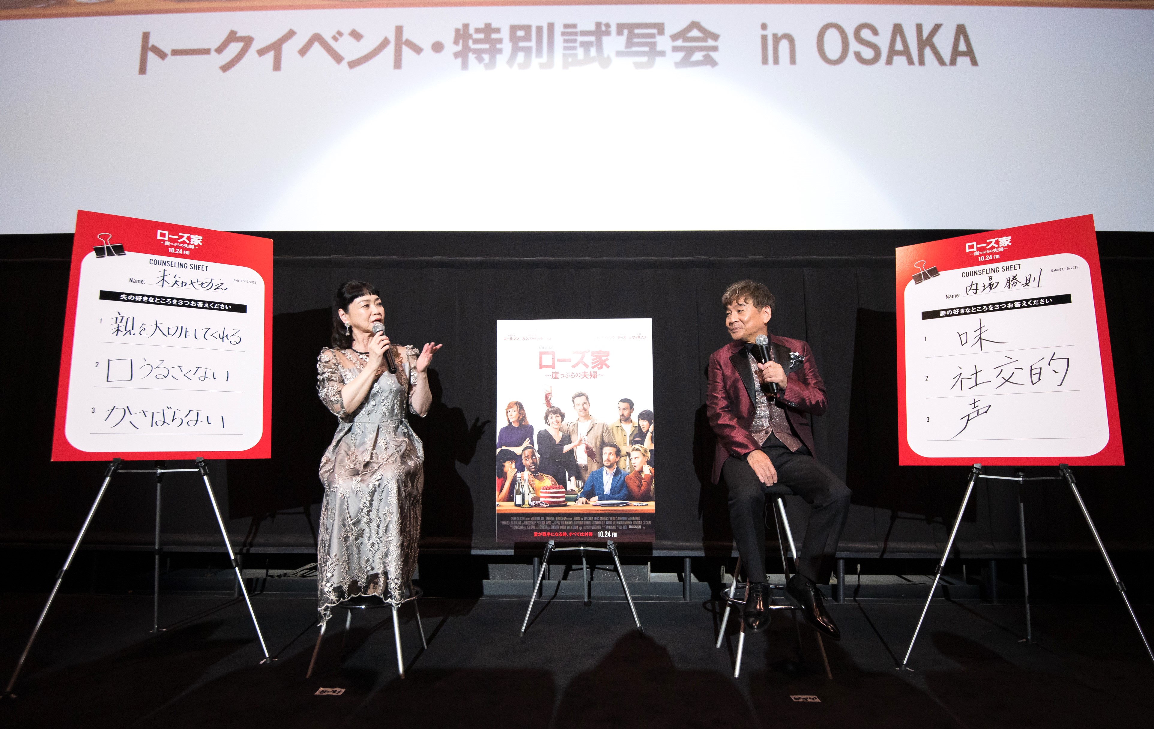 そしてこの度、公開を目前に控えた10月7日(火)に、特別ゲストとして内場勝則&未知やすえ夫妻が登壇する特別試写会が行われた。MCの呼び込みで、内場はタキシード姿で、同じくドレスで正装した未知をエスコートしてゲストの2人が登場すると、会場は大きな拍手で包まれた。集まった観客を前にまずは「旦那の方の内場勝則でございます~」「大黒柱の未知やすえです」と笑いを誘い、続いて内場が「この度はこう言う映画のゲストに呼んで頂き光栄でございます。まして夫婦と言うのも”レア”な状態なんで、映すなら今です!」と挨拶すると、未知も「吉本新喜劇のマドンナ、未知やすえです。」と挨拶し、始まってすぐ大きな笑いに包まれながらイベントがスタートした。